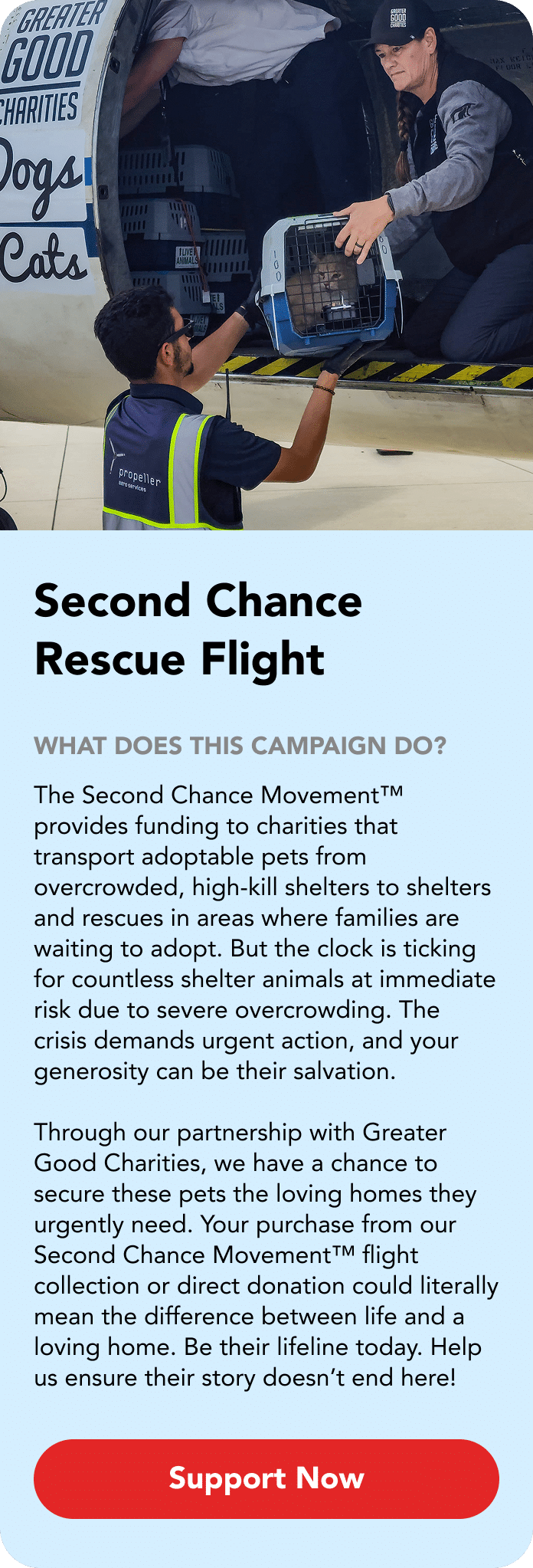 Through our partnership with Greater Good Charities, we have a chance to secure these pets the loving homes they urgently need. Your purchase from our Second Chance Movement™ flight collection or direct donation could literally mean the difference between life and a loving home. Be their lifeline today. Help us ensure their story doesn’t end here!