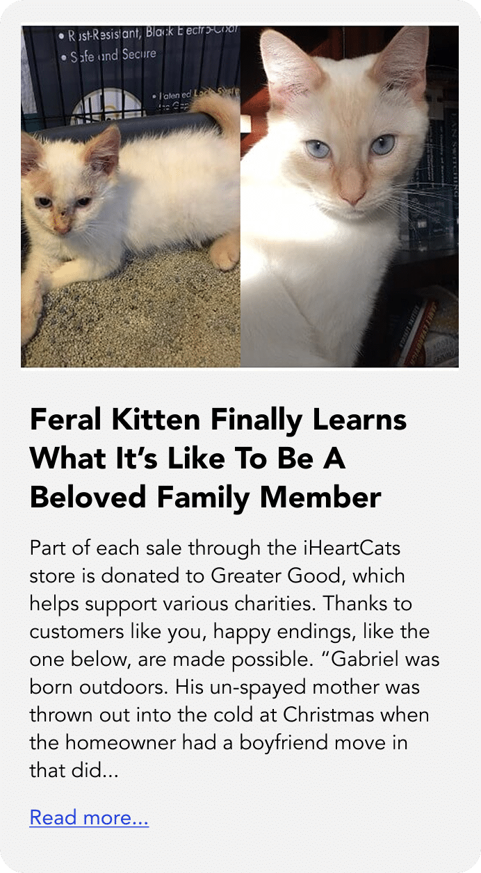 Part of each sale through the iHeartCats store is donated to Greater Good, which helps support various charities. Thanks to customers like you, happy endings, like the one below, are made possible. “Gabriel was born outdoors. His un-spayed mother was thrown out into the cold at Christmas when the homeowner had a boyfriend move in that did…