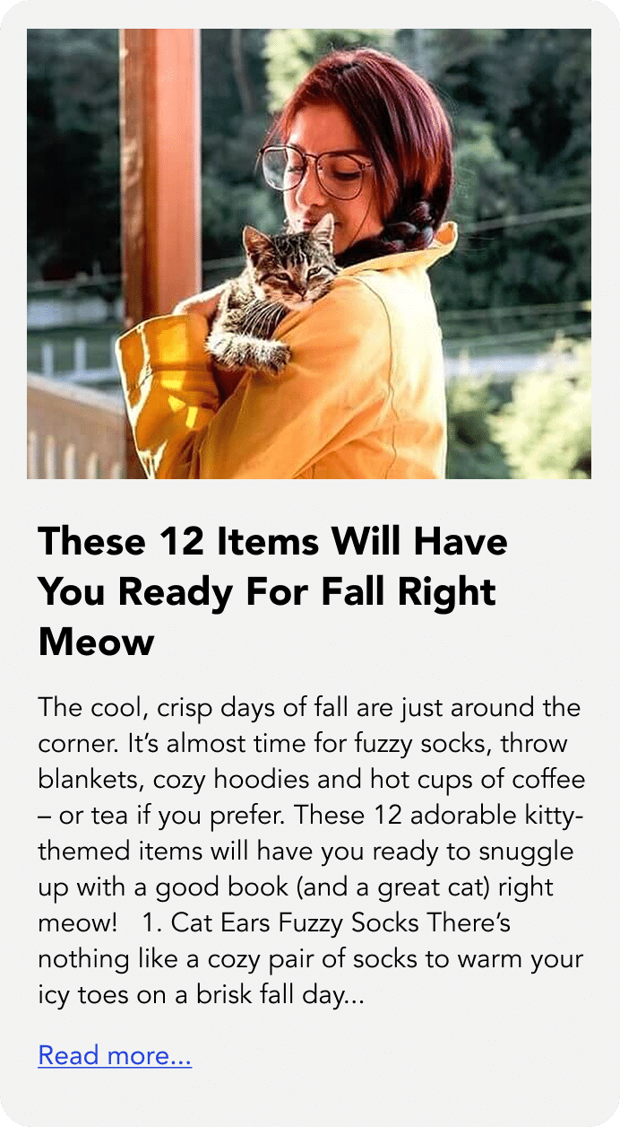 The cool, crisp days of fall are just around the corner. It’s almost time for fuzzy socks, throw blankets, cozy hoodies and hot cups of coffee – or tea if you prefer. These 12 adorable kitty-themed items will have you ready to snuggle up with a good book (and a great cat) right meow! 1. Cat Ears Fuzzy Socks There’s nothing like a cozy pair of socks to warm your icy toes on a brisk fall day…