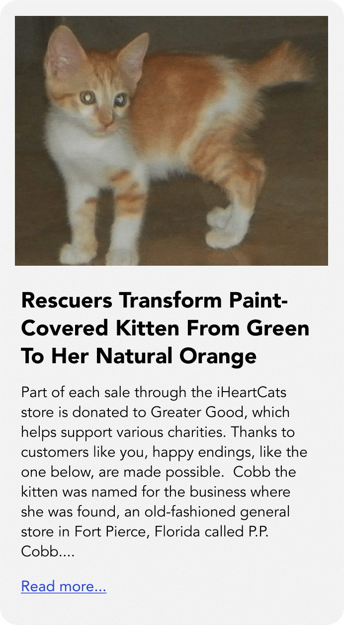 Part of each sale through the iHeartCats store is donated to Greater Good, which helps support various charities. Thanks to customers like you, happy endings, like the one below, are made possible. Cobb the kitten was named for the business where she was found, an old-fashioned general store in Fort Pierce, Florida called P.P. Cobb….