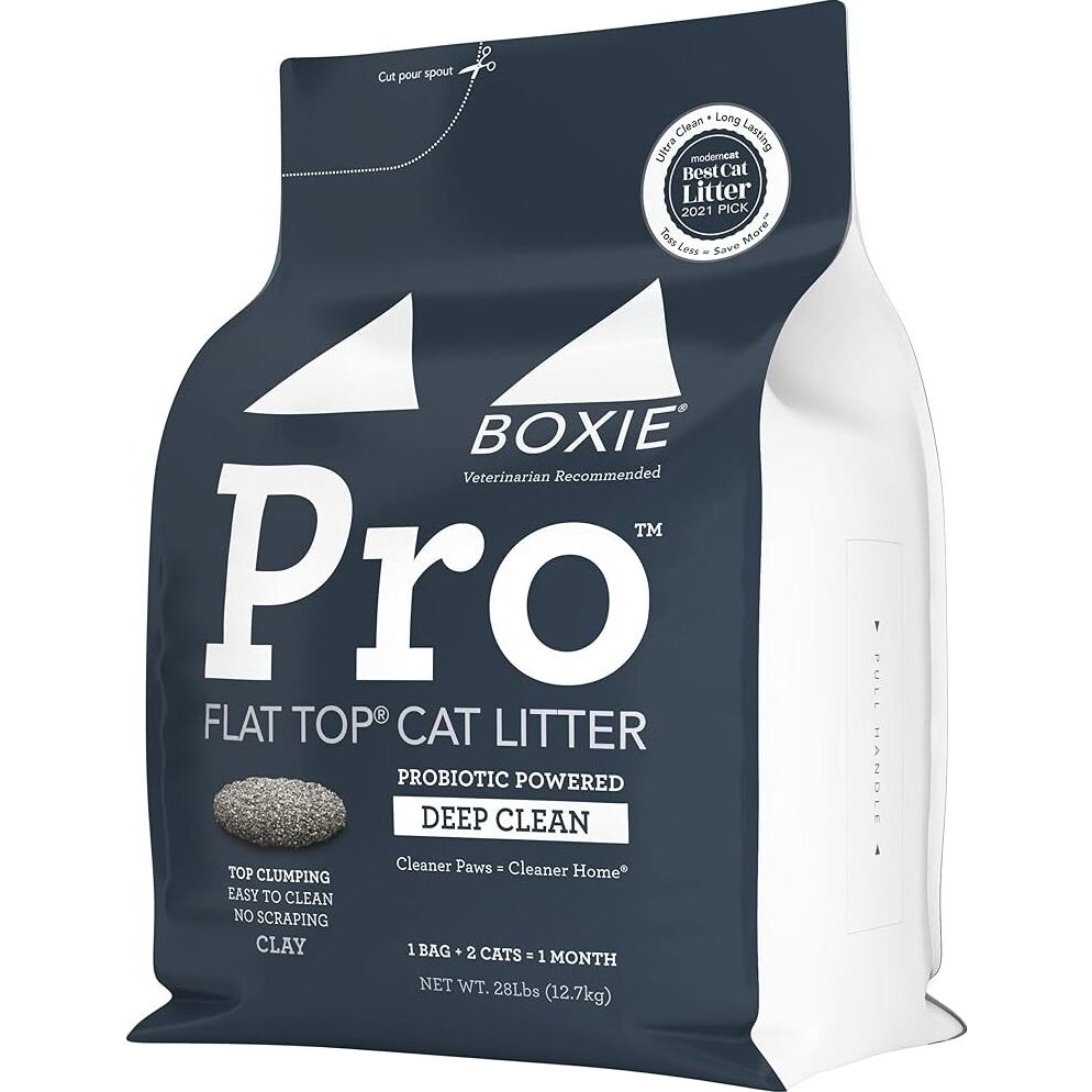 BoxiePro Deep Clean Probiotic Clumping Clay Cat Litter is a 28 lb cat litter that offers longer-lasting odor control and stays ultra clean. It is 99.9% dust-free, reducing the spread of waste in the home and targeting waste on a microscopic level with its natural probiotics. It is also scent-free and has won the 2018 Pet Business Industry Recognition Award.