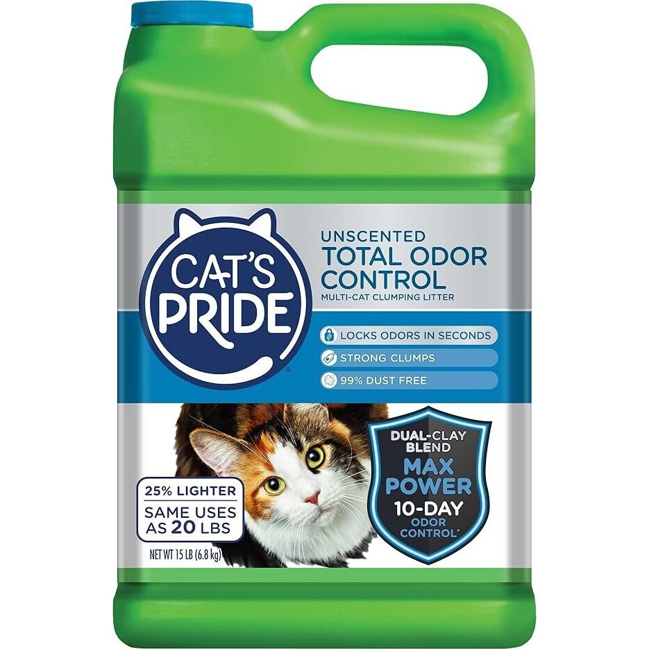 Cat’s Pride Max Power is a multi-cat litter that offers up to 10 days of powerful odor control. It features a patented Max Power dual-clay formula that is 99% dust-free and hypoallergenic, making it suitable for sensitive cats and households. For every jug purchased, Cat’s Pride donates one pound of litter to animal welfare organizations.