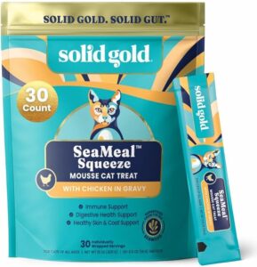 Solid Gold Lickable Cat Treats – Chicken SeaMeal Squeeze is a product that offers squeezable cat treats made with fiber-rich seaweed for digestive health and immune support. These treats contain flaxseed for healthy skin and coat and are free of artificial colors, flavors, and preservatives. They can be served as a treat, meal topper, or wet cat food, providing added nutrition to your cat’s diet.