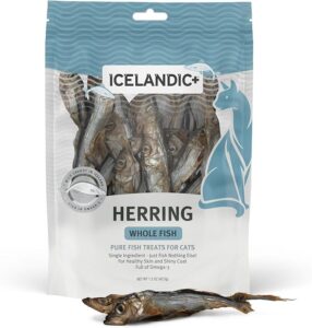 The Icelandic+ All-Natural Cat Treats are made from pure, sustainably sourced whole Herring, providing a 100% fully digestible and protein-rich snack for cats. These treats have less smell compared to other fish treats and help reduce plaque and tartar build-up for better dental health. With added blueberries, they also support a healthy immune system.
