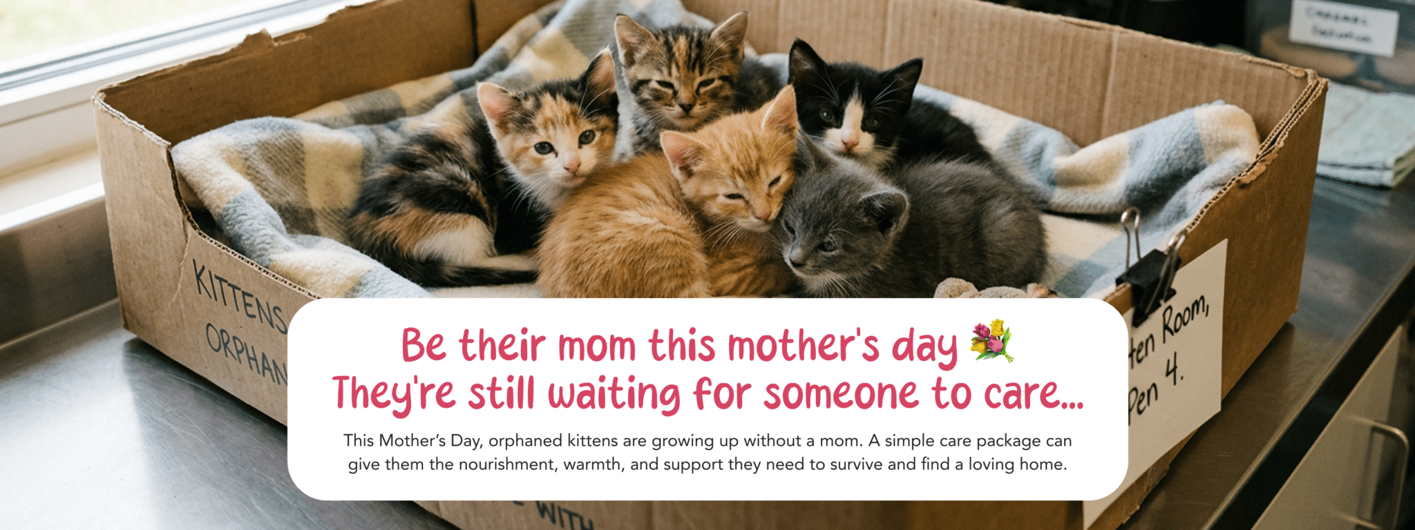 This Mother’s Day, we’re supporting orphaned kittens who are growing up without a mother. These young kittens still rely on consistent human care as they continue to grow and prepare for adoption.