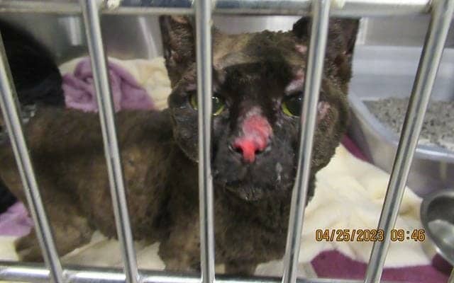 Libby had burns on her paw pads, ears, and nose. Melted plastic was reportedly stuck to her fur, and her hair and whiskers were singed. She was first treated at a local emergency clinic and then moved to the Arizona Humane Society’s trauma hospital to begin her healing journey. There, she received fluids under the skin, antibiotics, and pain relief medication. Her burns were cared for, and she was monitored for any lung damage from smoke inhalation.