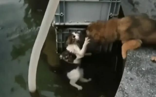 In the video, a cat is struggling in the water, desperately holding onto something to stay afloat. She looks scared and confused, not knowing how to get out. Then, a dog appears on the edge of what looks like a fish pond. He wants to help his feline friend escape!