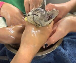 The kitten, later named Elmer, arrived in heartbreaking condition. Thick glue covered him from ear to tail, hardening around his face and sealing off vital areas like his mouth and eyes. He was limp, severely dehydrated, and barely responsive. Staff immediately understood that every second mattered.