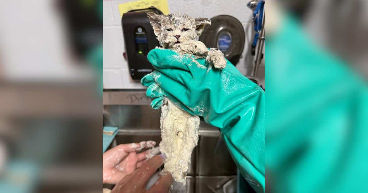 A tiny life hung in the balance when a 6-week-old kitten was brought into the Humane Society of North Texas on March 31, after a concerned passerby discovered him trapped in a bucket of industrial adhesive. His fragile body was completely coated in thick glue, leaving him unable to move, eat, or care for himself in any way. Each breath seemed uncertain as the sticky substance hardened around his face and limbs, turning an already terrifying situation into a race against time for the rescuers determined to save him.