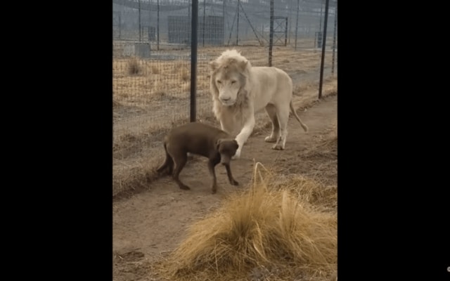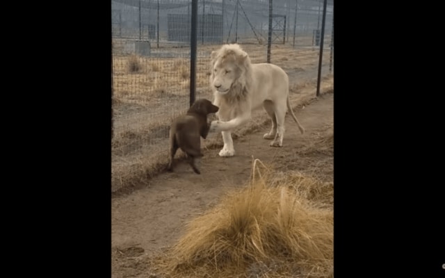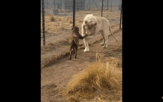 “An amazing bond between two friends since they were young. A mighty white lion and chocolate lab. Watch as the lion goes and kisses the dogs paw. Video shot at the Black Jaguar White Tiger foundation as part of Toyquest101 visit to the foundation.”