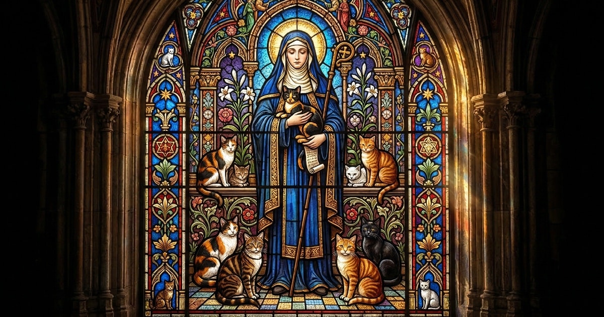 It is only in recent decades, around the early 1980s, that Gertrude became associated with cats. The connection seems to have appeared quietly, almost as if the animals themselves chose her. Today, images and stories often depict her as their patron saint, even though history offers no direct evidence of this bond.