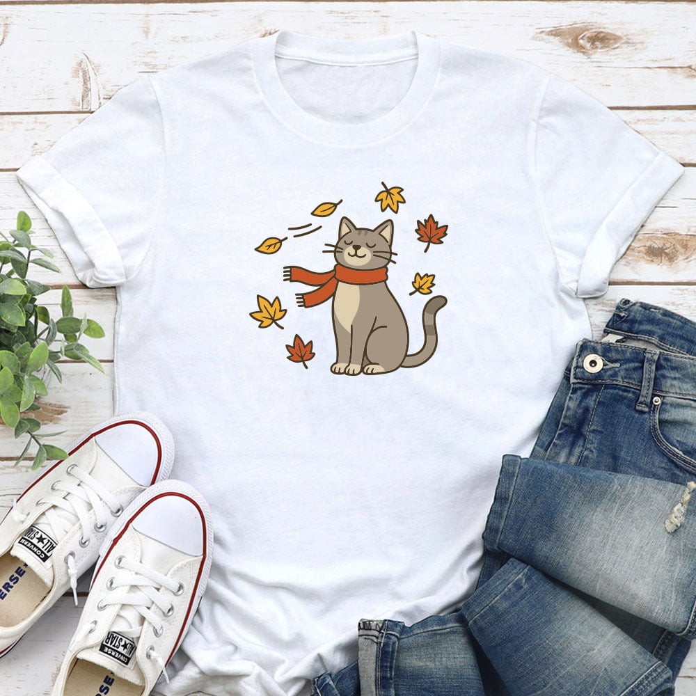 Autumn Leaves Cat Standard Tee White