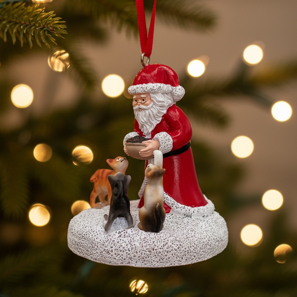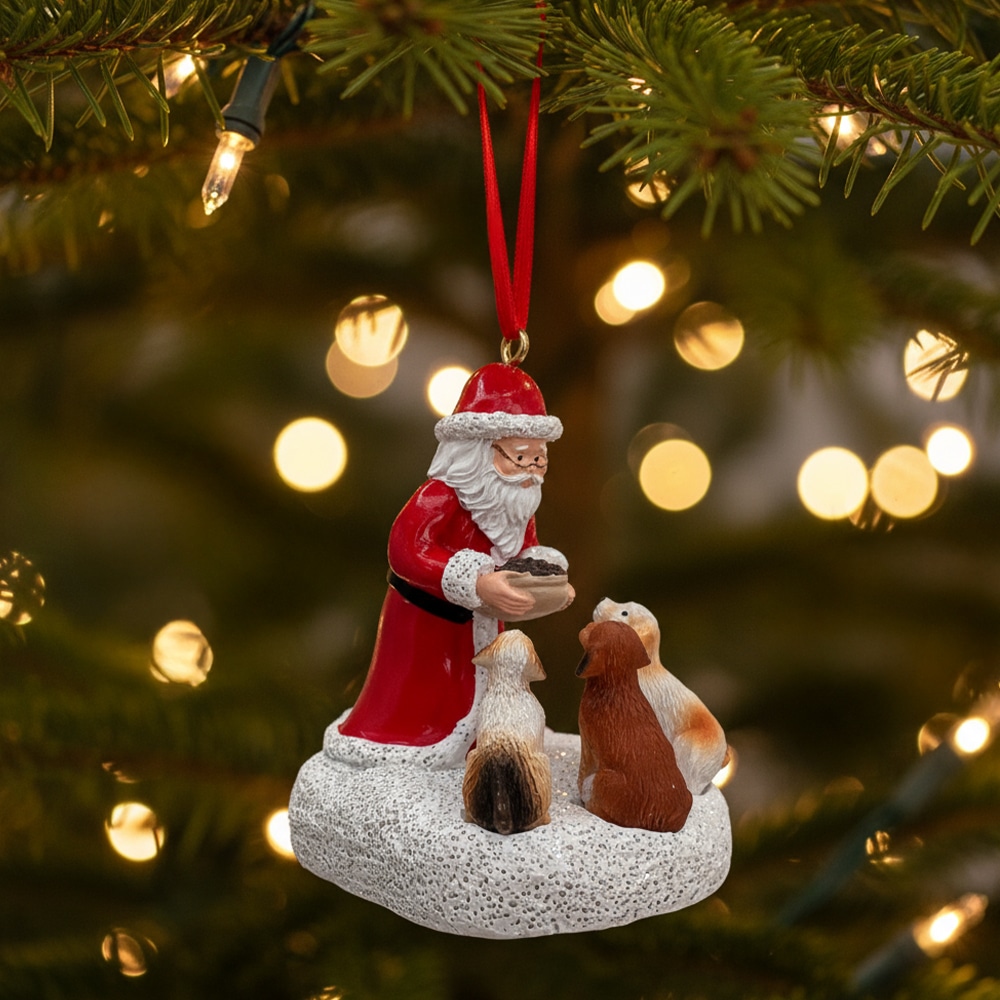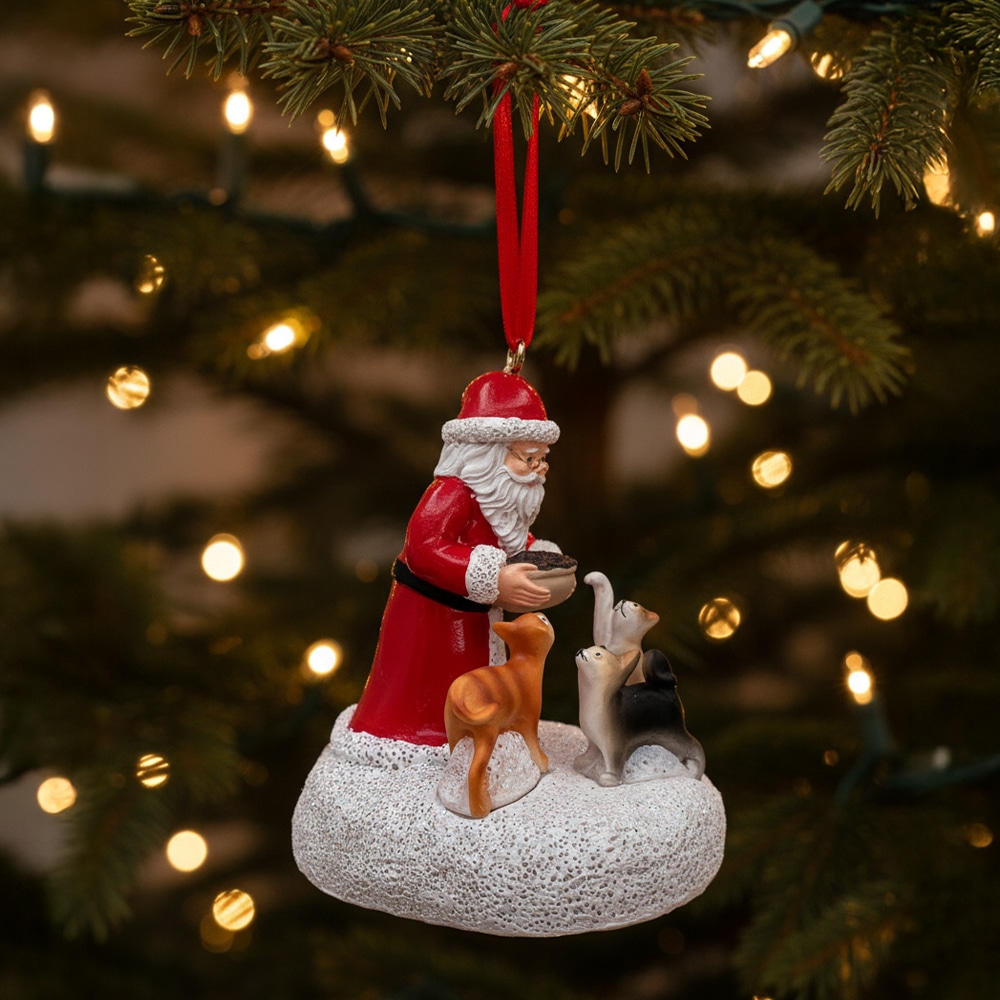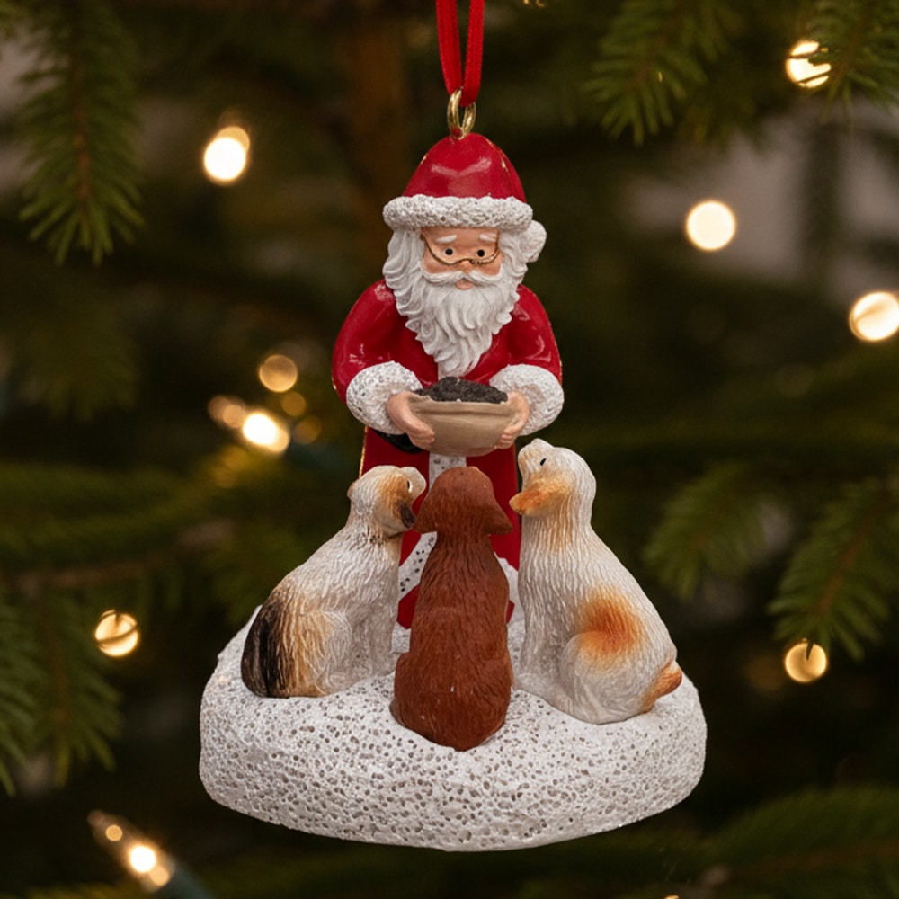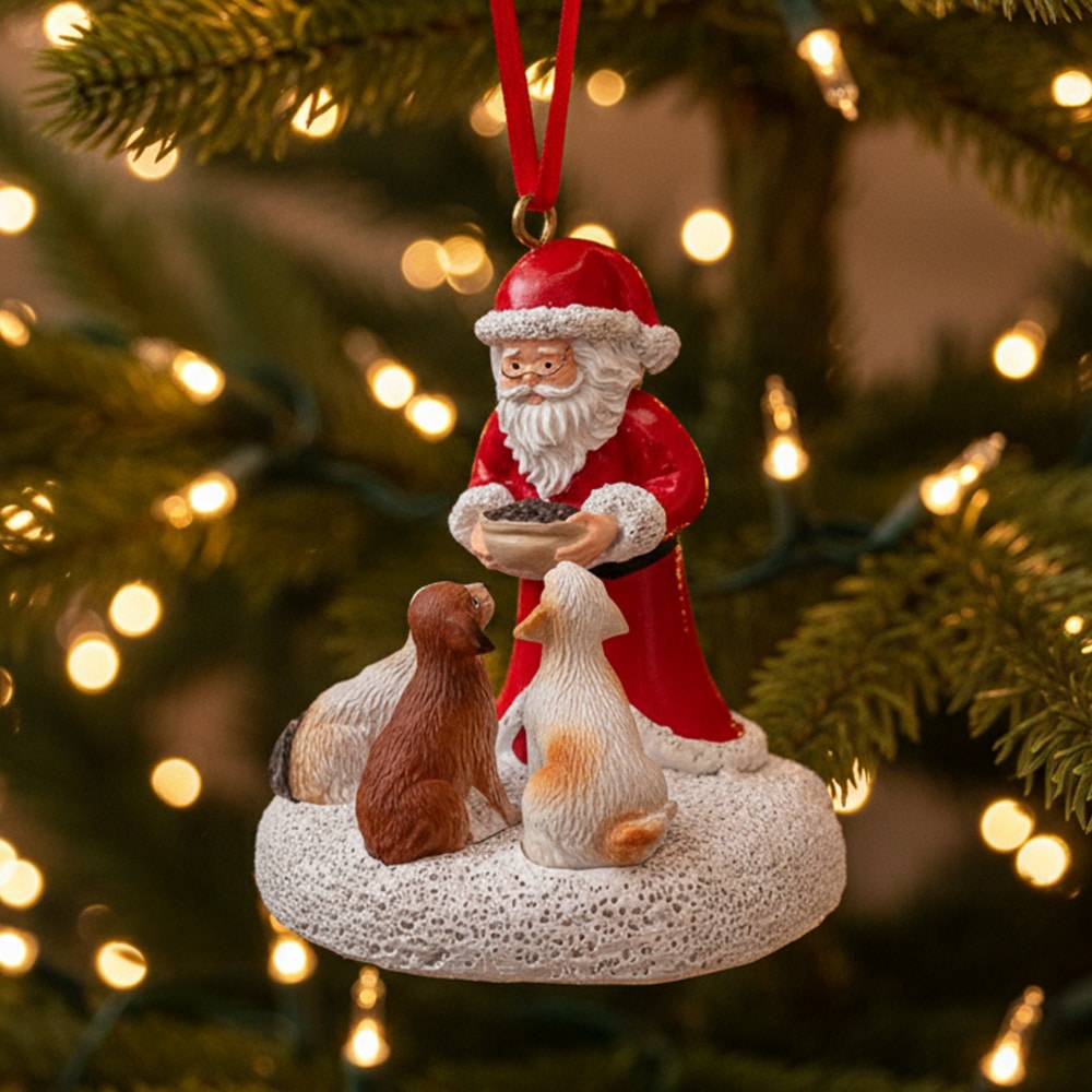 The Santa’ s Light Of Hope- A Cat’s Christmas Wish & A Dog’s Christmas Wish Collectible Ornamenst captures a touching holiday moment as Santa lovingly shares a bowl of food with three cozy, curious kitties & three hungry pups —reminding us that the heart of the season lies in compassion, not presents.