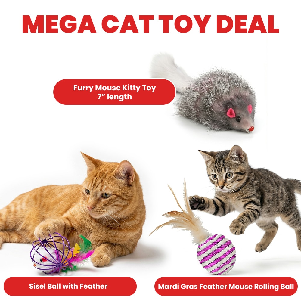SUPER DEAL! SET Triple Pounce Cat Toy Bundle – Roll’n Mouse Chaser, FeatherTwist Pink Ball and Furry Fluffy Gray Mouse Cat Toys