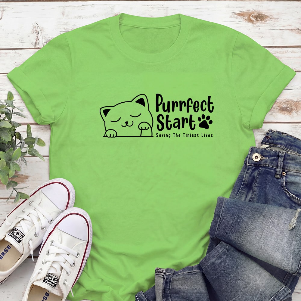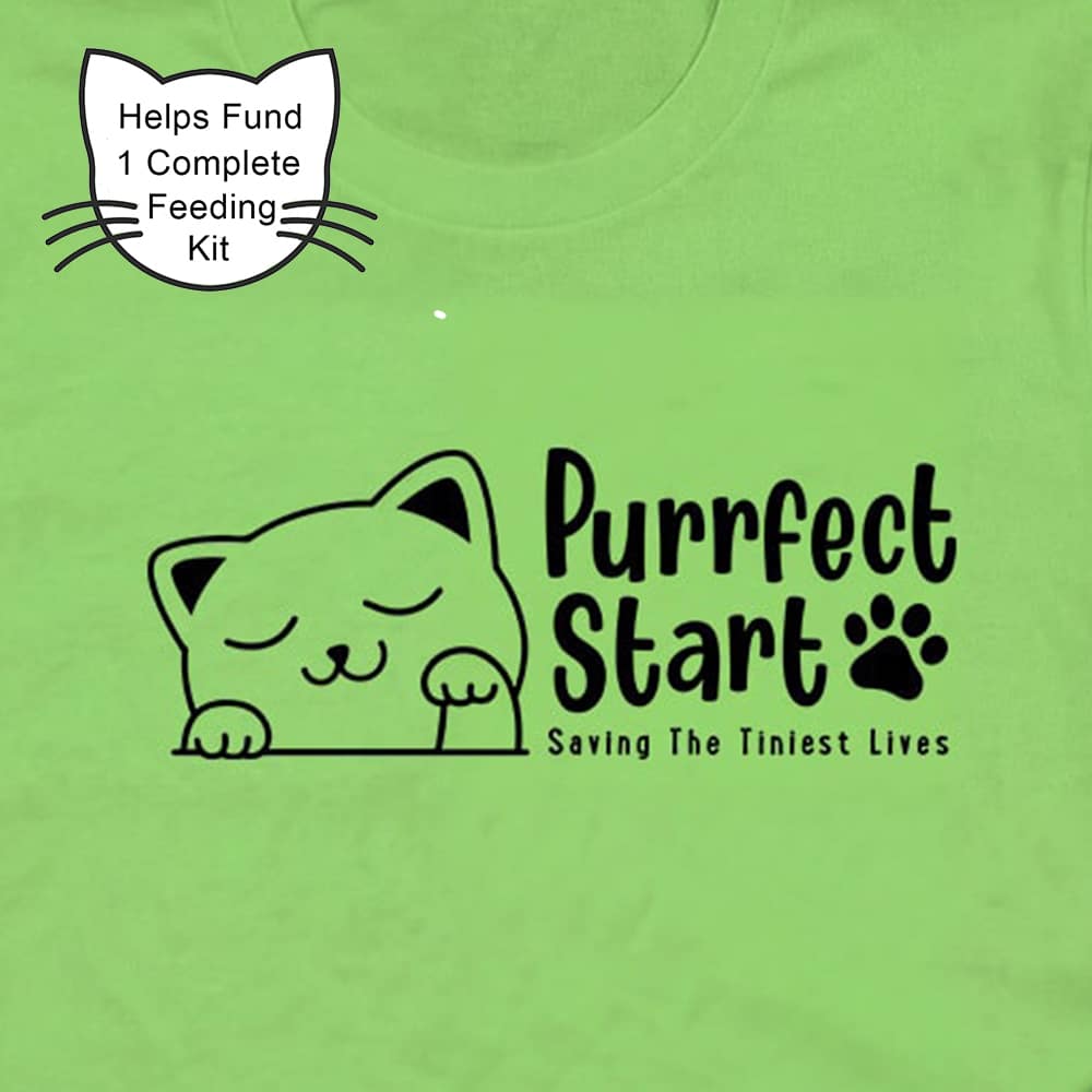 Purrfect Start – Hello Sweet Kitty Standard Tee Lime Green – Helps Fund 1 Feeding Kit to Save Kittens’ Lives