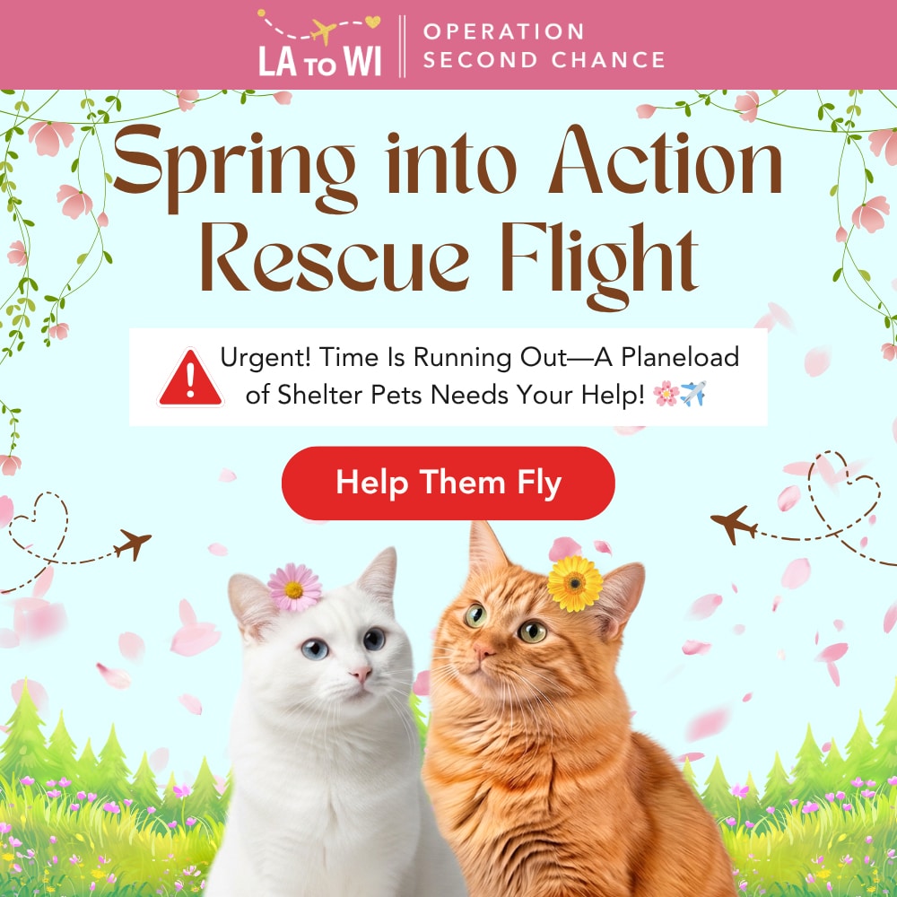 On May 10th, our Spring into Action Rescue Flight will take off—transporting at-risk dogs and cats from Louisiana to loving shelters in Wisconsin, where families are waiting.