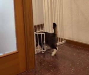 The scene is simple. A tall pet gate stands between the cats and where they want to go. At the bottom sits a small, perfectly usable cat door. The solution seems obvious.
