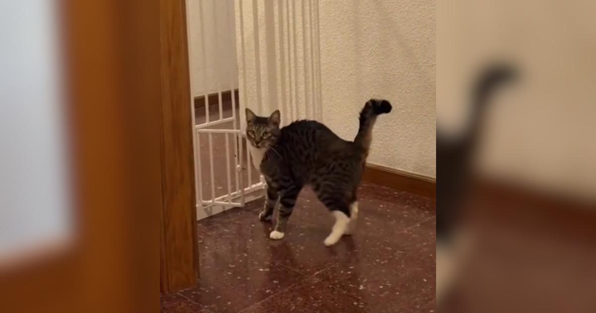 The scene is simple. A tall pet gate stands between the cats and where they want to go. At the bottom sits a small, perfectly usable cat door. The solution seems obvious.