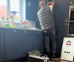He lets out a series of insistent meows, his voice filled with confusion and mild protest. To him, this is not just a repair job. It is an intrusion. Someone is clearly tampering with what he believes is his cupboard.