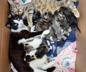 Now in foster care, their world looks very different. The cold ground has been replaced with soft bedding. Food is no longer scarce. And instead of hiding in fear, the cats can rest peacefully while their kittens grow stronger each day.